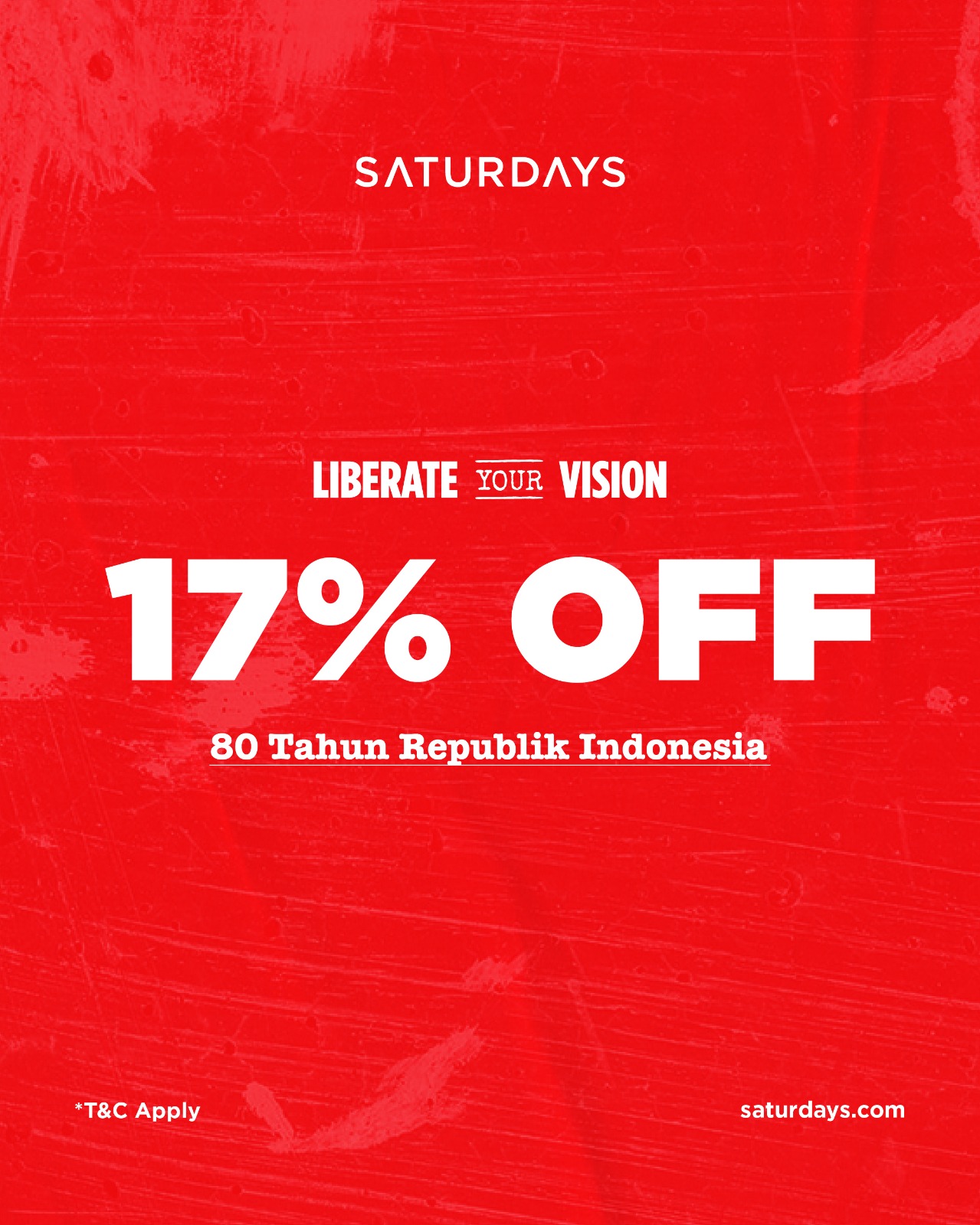 Merdeka dengan visi baru dan nikmati potongan 17% untuk semua frame dan lensa! Promo berlaku mulai 16–24 Agustus dengan pembelanjaan minimum Rp 1,495K di SATURDAYS Emporium Pluit Mall Lantai UG!